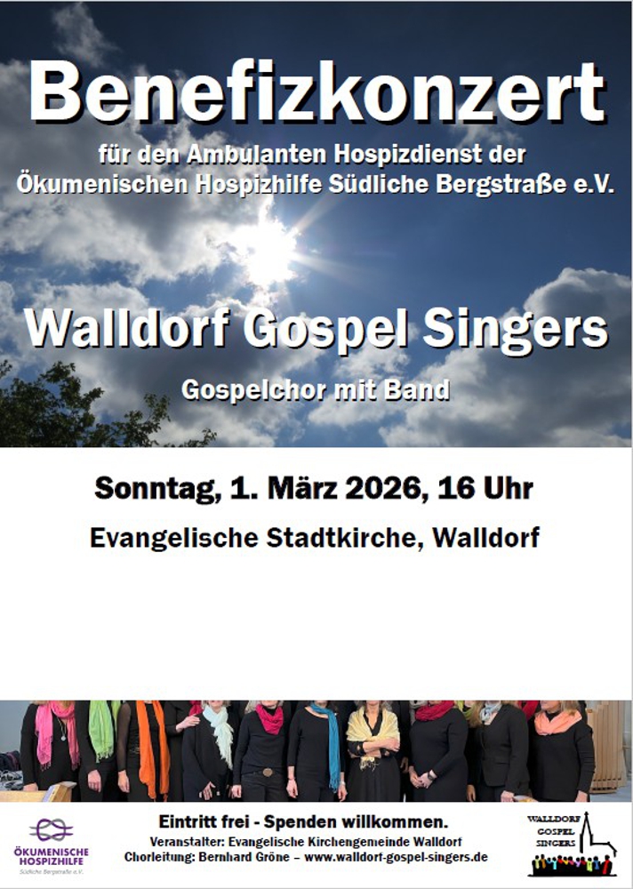 Wie klingt es, wenn ein Gospelchor mit Band und Solisten in einer Kirche spielt, und das für einen guten Zweck? Gospel ist sehr abwechslungsreich, international und voller Schwung und Gefühl, was man den Walldorf Gospel Singers ansieht. Diese geben am Sonntag, 1. März um 16.00 Uhr in der evangelischen Stadtkirche in Walldorf ein Benefizkonzert zugunsten des Ambulanten Hospizdienstes der Ökumenischen Hospizhilfe Südliche Bergstraße e. V. Der Eintritt ist frei, um Spenden wird jedoch gebeten, um damit die Arbeit der ehrenamtlichen Mitarbeiter des Ambulanten Hospizdienstes zu unterstützen. Seit über 30 Jahren umfasst diese Arbeit in erster Linie die Betreuung und Begleitung Schwerkranker und Sterbender und ihrer Angehörigen. Ein würdiges Leben bis zuletzt zu ermöglichen ist erklärtes Ziel der Hospizhilfe.
