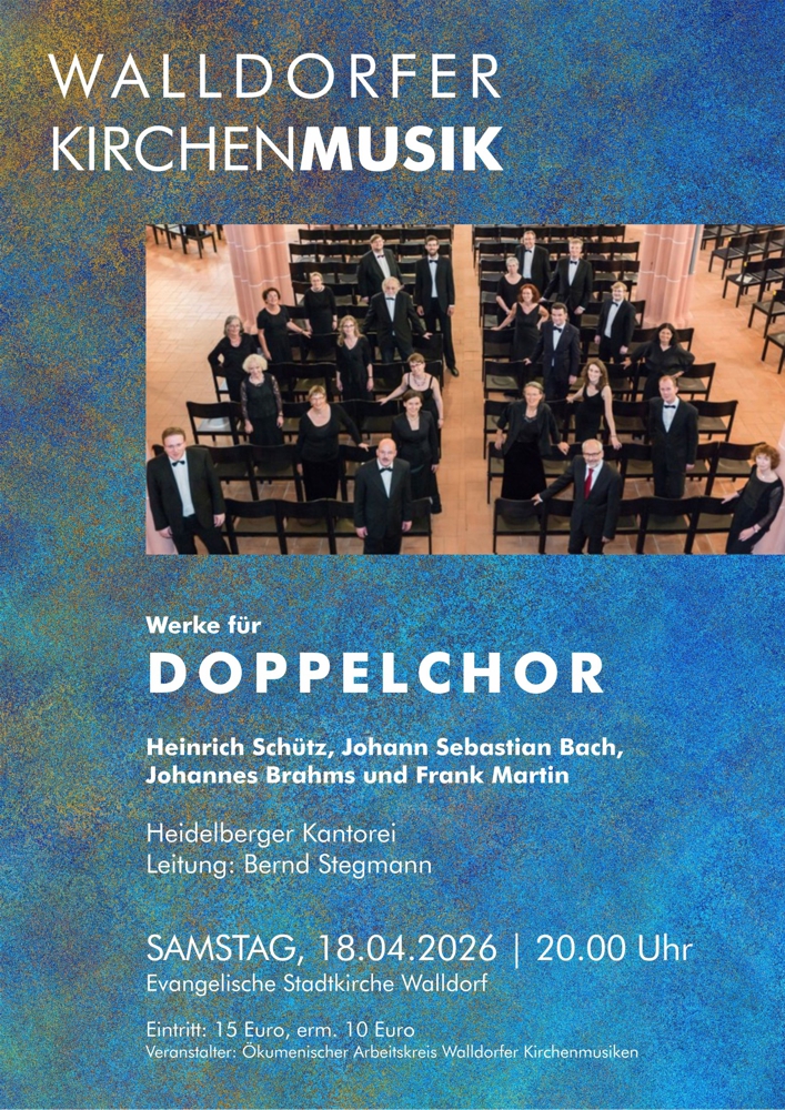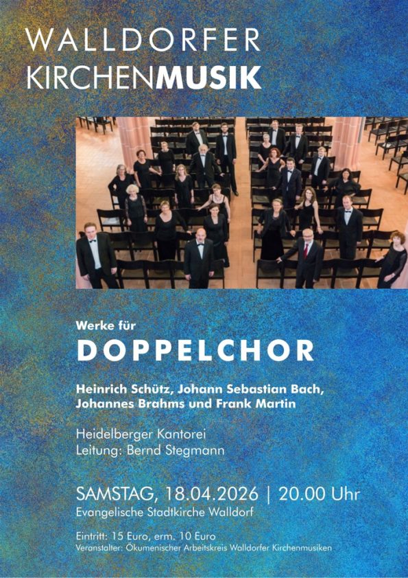 Am Samstag, dem 18. April 2026, um 20.00 Uhr präsentiert die Heidelberger Kantorei unter dem Titel Doppelchor ein außergewöhnliches Programm mit drei monumentalen Werken der a cappella Literatur aus drei Jahrhunderten. Das Motto beschreibt zugleich das musikalische Prinzip: Zwei Chorgruppen treten in einen lebendigen Dialog, spiegeln und kontrastieren einander.