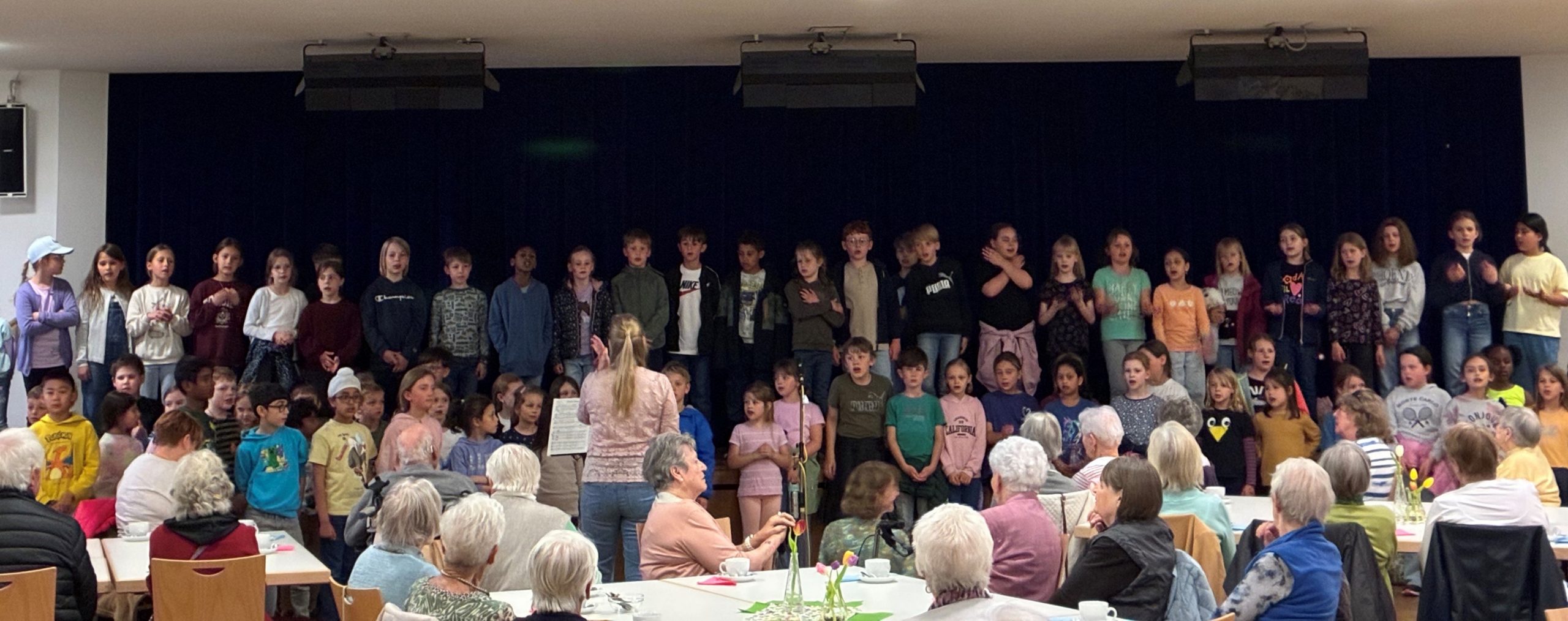Und wieder einmal war der gemeinsame Auftritt des Schülerchors der Schillerschule und der Waldschule das Highlight des diesjährigen Frühlingskaffees des Walldorfer Mittagstischs. Zuvor waren etwa 50 Gäste unserer Einladung gefolgt und hatten sich in geselligen Tischrunden im katholischen Pfarrsaal eingefunden. Mit einem bunten Potpourri aus altbekannten, aber auch ganz neuen Liedern sorgten die Jungen und Mädchen für gute Stimmung, hatten schnell die Herzen unserer Besucher gewonnen und wurden dann auch mit großem Beifall belohnt. Beseelt von der Lebensfreude, die die Kids ausgestrahlt hatten, ließen sich danach alle Gäste bei einer Tasse Kaffee ein leckeres Stück Zitronentorte schmecken. Gesponsert wurde die Torte diesmal von der Kleiderstube. Herzlichen Dank an dieser Stelle an das ganze Team. Herzlichen Dank auch an die Chorleiter Frau Meier und Frau Jansenberger von der Schillerschule und Frau Bienhaus und Herr Haberkorn von der Waldschule, die immer mit so viel Freude und Leidenschaft diese wunderbaren Chorauftritte arrangieren und uns daran teilhaben lassen. Wir freuen uns schon auf den nächsten Auftritt der Kinder bei unserem Adventskaffee im Dezember!