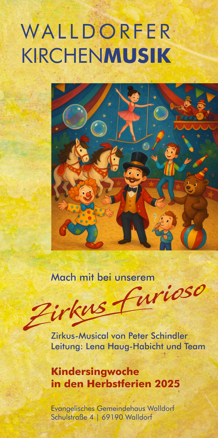Der ökumenische Arbeitskreis Walldorfer Kirchenmusik veranstaltet vom 27. Oktober bis 31. Oktober (jeweils von 9.30 Uhr -15.00 Uhr) eine Kindersingwoche im evangelischen Gemeindehaus. Mitmachen können Kinder im Alter von 6-12 Jahren. Lena Haug-Habicht, vielen sicherlich bekannt durch die musikalische Früherziehung, konnte für die Leitung gewonnen werden. Mit „Zirkus Furioso“ von Peter Schindler wird sie ein farbenfrohes Musical mit den Kindern einstudieren – es wird gesungen, getanzt, gebastelt – und am 1. November, 16 Uhr heißt es dann „Manege frei“ im evang. Gemeindehaus Walldorf.