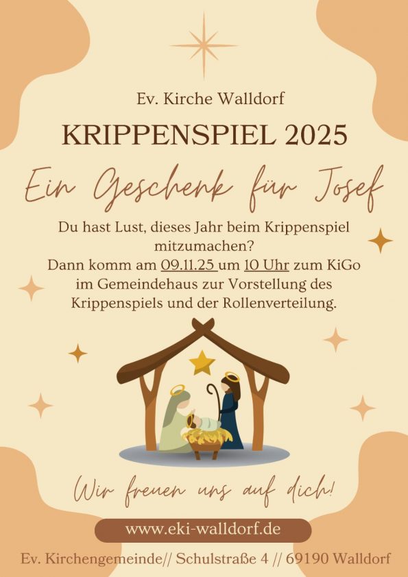 Noch 7 Wochen bis Weihnachten – und schon laufen die Proben für das große Krippenspiel an. Das KiGO-Team hat unter dem Titel „Ein Geschenk für Josef“ ein Krippenspiel selbst geschrieben. Alle Kinder von 3-12 Jahren sind herzlich eingeladen, sich zu beteiligen. Es gibt alle möglichen Arten von Rollen: Von großen Sprechrollen über kleine Texte bis hin zum wichtigen Dabeisein in Kostümen. Kommt einfach am 9. November um 10 Uhr dazu, wenn das Team das Krippenspiel vorstellt. Dort dürfen auch gerne Wünsche für die Rollen geäußert werden. Ihr könnt sicher sein: Jeder und Jede haben Spaß, wenn es am 24. Dezember um 16 Uhr in der Stadtkirche heißt: Ein Geschenk für Josef!