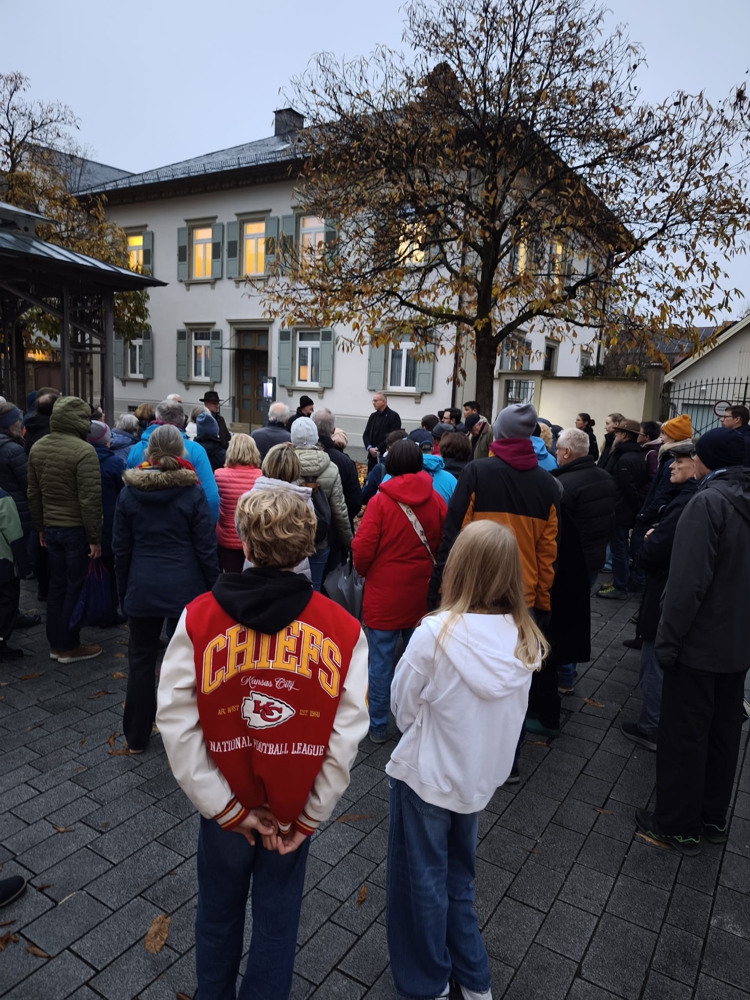 Nach einer Begrüßung am Marktplatz durch Pfarrer Boch und einleitenden Worten von Andy Herrmann, durfte man Andy an Orte folgen, die am 9./10. November 1938 in Walldorf eine wichtige Rolle gespielt haben. Am Hotel Zum Weißen Rössel, dem Schloßplatz und am Sparkassenvorplatz gab es jeweils einen – angesichts des Regens – kurzen Vortrag über die Geschehnisse. Man hörte von Sannchen Kramer, deren Habseligkeiten aus dem Haus geworfen und verbrannt wurden. Und davon, dass die Entzündung der Synagoge gerade noch verhindert wurde, weil man den Ortskern mit Häusern von Nazi-Funktionären schützen wollte. Klar war am Ende: Alle in Walldorf wussten von dem Geschehen, fand es doch bei hellem Tageslicht statt. Und nachweislich haben viele zugeschaut.